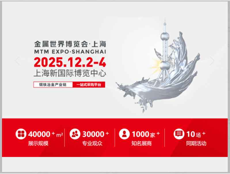 2025金屬世界博覽會(MTMEXPO)將于2025年12月2日-4日在上海新國際博覽中心盛大舉辦。本屆博覽會將以“科技創(chuàng)新、綠色低碳、智能制造、***集約&rd...
